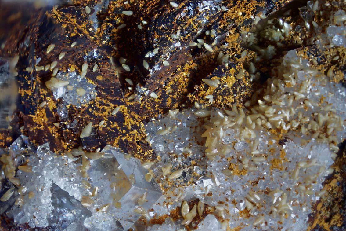 Bildbreiten (1-3) jeweils 4,5 mm; (4) = Detail aus (2) BB 1 mm; (5) BB 4,5 mm; (6) = Detail aus (3) BB 1 mm; (7) BB 4,5 mm; (8) mit Chalkopyrit; Fluorit; BB 4,5 mm