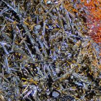 (1+2) jeweils BB 4,5 mm - (1) Fund vom 17.08.1997, (2) am rechten Rand Übergang in Metastibnit, da der Berthierit hier teils glasartig überkrustet und leicht grünlich wirkt, ist hier evtl von Valentinit auszugehen.