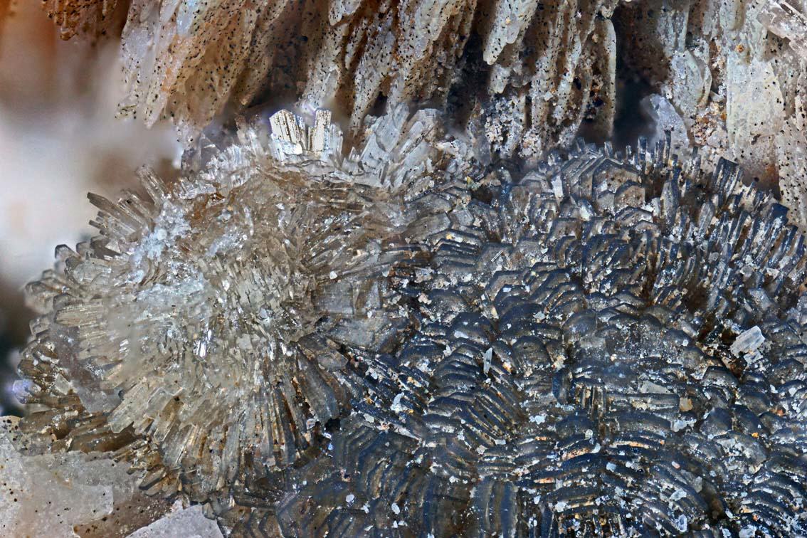 (1-4) BB jeweils 6,5 mm - (3) mit Quarz, (4) mit Hemimorphit-Sphärolithen / (5) BB 2,5 mm = Ausschnitt aus (4)
