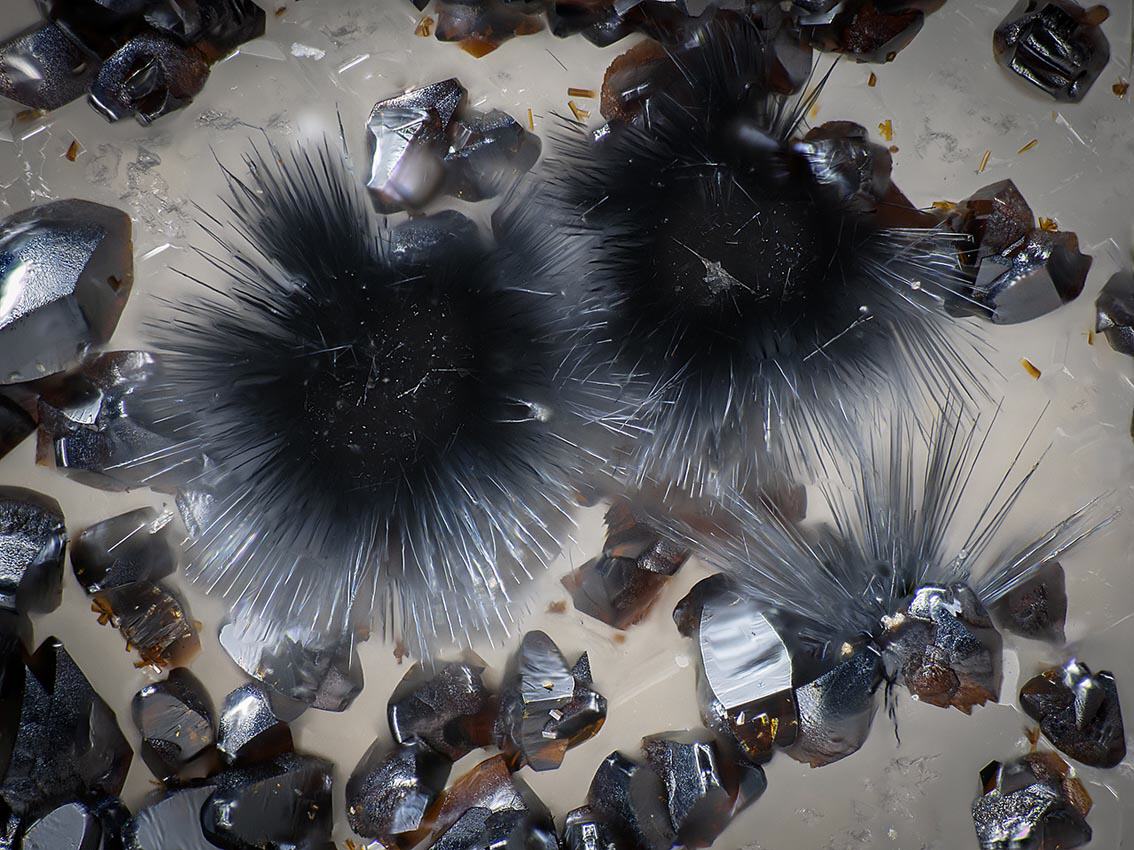 Photos oben: (C) Markus Noller, Slg. Reinhard Motzigemba; Hämatiti auf Ferberit; BB 3,2 mm